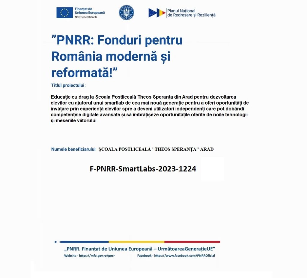 „Educație cu drag la Școala Postliceală Theos Speranța din Arad pentru dezvoltarea elevilor cu ajutorul unui smartlab de cea mai nouă generație pentru a oferi oportunități de învățare prin experiență elevilor spre a deveni utilizatori independenți care pot dobândi competențe digitale avansate și să îmbrățișeze oportunitățile oferite de noile tehnologii și meseriile viitorului”